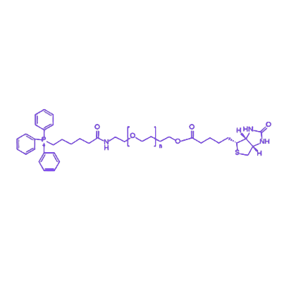 该化合物以线性聚乙二醇(PEG)链为柔性连接臂,一端共价结合具有线粒体靶向特性的三苯基膦(TPP)基团,另一端偶联高亲和力的生物素(Biotin)分子。这种模块化结构赋予产品优异的水溶性和生物稳定性,可有效减少非特异性结合。在物化性质方面,PEG链的引入显著降低了分子的免疫原性,而TPP基团的正电荷特性使其能够通过线粒体膜电位差实现靶向富集。在应用价值上,该探针可通过生物素-链霉亲和素系统实现与生物素化抗体、酶或纳米载体的特异性偶联,广泛用于线粒体功能分析、亚细胞水平药物递送及蛋白质组学研究等领域,为生命科学研究提供了精准的分子工具。