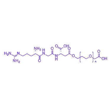 该化合物的分子结构以线性PEG链为核心骨架,一端修饰有特异性识别细胞表面整合素受体的RGD三肽序列,另一端则保留可反应的羧基活性基团,形成“靶向配体-柔性间隔臂-活性位点”的三段式结构。这种设计赋予材料双重功能:RGD肽段通过与整合素受体的特异性相互作用介导主动靶向,而PEG链的引入可有效减少非特异性蛋白吸附并延长体内循环时间,羧基则为后续偶联药物分子、纳米载体或生物活性组件提供化学修饰位点。其典型分子量范围为1,000-20,000 Da,在水及缓冲液中具有良好溶解性,可通过N-羟基琥珀酰亚胺(NHS)活化或碳二亚胺(EDC)催化实现与伯胺等基团的高效偶联。在应用层面,该材料可用于制备靶向性纳米载药系统,通过RGD介导的主动靶向提升药物在肿瘤组织的富集效率;同时,其末端羧基可便捷固定于固相载体表面,构建生物分子识别界面,在细胞成像、受体研究及诊断试纸条开发中具有重要价值。