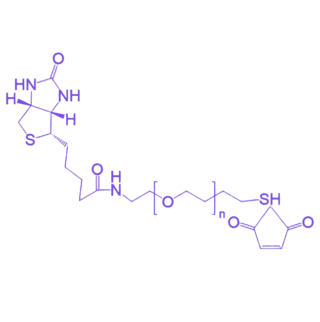 该分子通过醚键将马来酰亚胺基团(MAL)与聚乙二醇(PEG)链段连接,末端修饰生物素(BIOTIN)结构单元,形成A-B-C型三嵌段分子架构。其化学结构赋予了产品良好的水溶性与生物惰性,在生理条件下可稳定存在,且能通过马来酰亚胺与巯基的特异性反应实现靶向偶联。该产品可作为分子桥梁,将生物活性分子(如抗体、酶)与载体系统高效连接,在蛋白质工程、靶向药物开发及生物检测等场景中发挥关键作用,尤其适用于需要精准位点修饰的生物偶联体系构建。