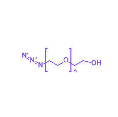 该化合物分子结构中,叠氮基团(-N3)赋予其通过点击化学反应(如CuAAC)高效偶联生物分子的能力,而羟基末端(-OH)则提供了进一步衍生化修饰的反应位点,可通过酯化、醚化等反应引入靶向配体或其他功能基团。聚乙二醇链段的引入有效改善了材料的水溶性和生物相容性,降低了非特异性蛋白吸附,使其在生物医学应用中表现出优异的稳定性和生物安全性。其物化性质可通过调控聚乙二醇链的分子量实现精准控制,满足不同场景下的动力学需求和空间位阻要求,是构建多功能生物医用材料的理想模块化组件。