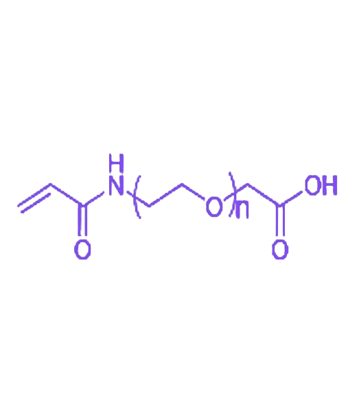 该化合物分子结构由三部分组成:一端为丙烯酸酯基团(ACA),可通过紫外光或自由基引发进行交联反应;中部为线性聚乙二醇链段(PEG),赋予产品良好的水溶性、柔韧性及空间位阻效应;另一端为羧基基团(COOH),可通过活化后与含氨基或羟基的生物分子发生共价偶联。其数均分子量可在500-20000 Da范围内精准调控,在水系缓冲液中具有优异的分散稳定性,且在pH 4-8条件下保持化学结构稳定。该产品可作为生物相容性间隔臂用于构建纳米药物载体,通过丙烯酸酯基团实现载体的光交联固化,同时利用羧基功能化实现靶向配体或药物分子的定点偶联,在肿瘤靶向治疗、组织工程支架制备等领域具有重要应用价值。