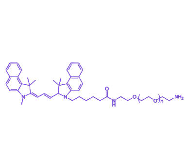 该产品的分子结构以线性PEG链为亲水骨架,一端通过稳定的化学键连接Cy3.5荧光团,另一端修饰有高反应活性的氨基基团,可与羧酸、活性酯等官能团发生高效偶联反应。Cy3.5作为近红外荧光染料,具有斯托克斯位移大、光稳定性强及组织穿透深度优异的特性,适用于活体成像及高灵敏度检测。PEG链段的引入有效提升了材料的水溶性和生物相容性,降低了非特异性结合,而末端氨基的化学活性使其能够实现与蛋白质、多肽、抗体等生物分子的精准偶联,在荧光免疫分析、细胞示踪、药物靶向递送等领域展现出重要应用价值。