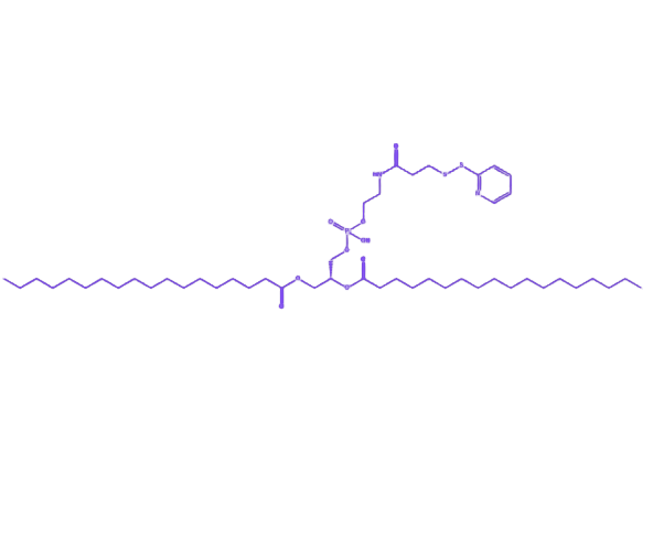 该化合物的磷脂部分由1,2-二硬脂酰基-sn-甘油-3-磷乙醇胺(DSPE)构成,其疏水尾部含两条硬脂酸链(C18:0),亲水头部为磷酸乙醇胺基团。通过3-(2-吡啶基二硫代)丙酸酯连接臂,将功能性基团共价结合到DSPE的磷酰乙醇胺头部,形成完整的分子结构。为提升化合物在水溶液中的溶解性能和化学稳定性,分子中添加钠离子作为平衡离子。