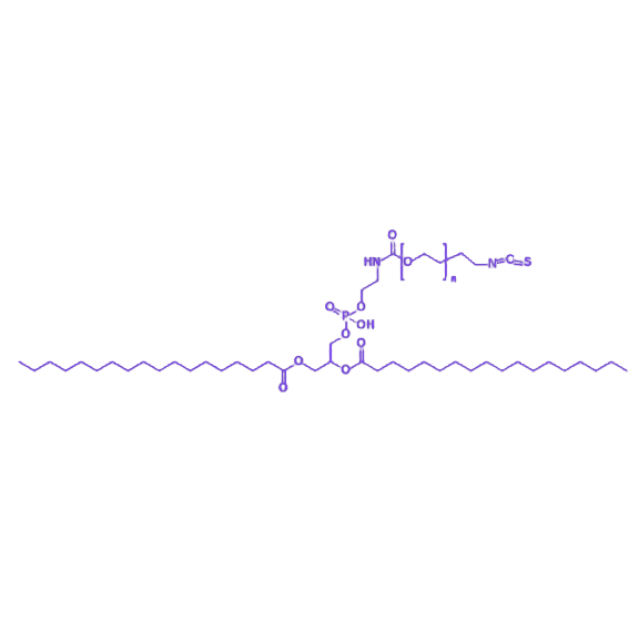 该产品的分子结构由三部分构成:疏水端为二硬脂酰基磷脂酰乙醇胺(DSPE),可插入脂质双分子层形成稳定的膜结构;亲水段为聚乙二醇(PEG)链,能显著提升材料的水溶性和血液循环半衰期,减少非特异性蛋白吸附;末端修饰的异硫氰酸酯(ISC)基团则赋予材料与氨基(-NH₂)发生特异性共价结合的能力,可高效偶联抗体、肽段等靶向配体或生物活性分子。在物化性质方面,该化合物呈现白色至类白色粉末状,易溶于氯仿、甲醇等有机溶剂,在水性缓冲液中可自组装形成纳米级胶束或脂质体结构,其临界胶束浓度(CMC)和粒径分布可通过PEG链长度调控。在应用价值上,DSPE-PEG-ISC通过靶向配体偶联可构建主动靶向递药系统,实现药物在病灶部位的精准释放;同时,其修饰的纳米载体具备长循环特性,能降低网状内皮系统清除率,提高药物生物利用度,在肿瘤治疗、基因递送及生物成像等领域具有重要应用前景。