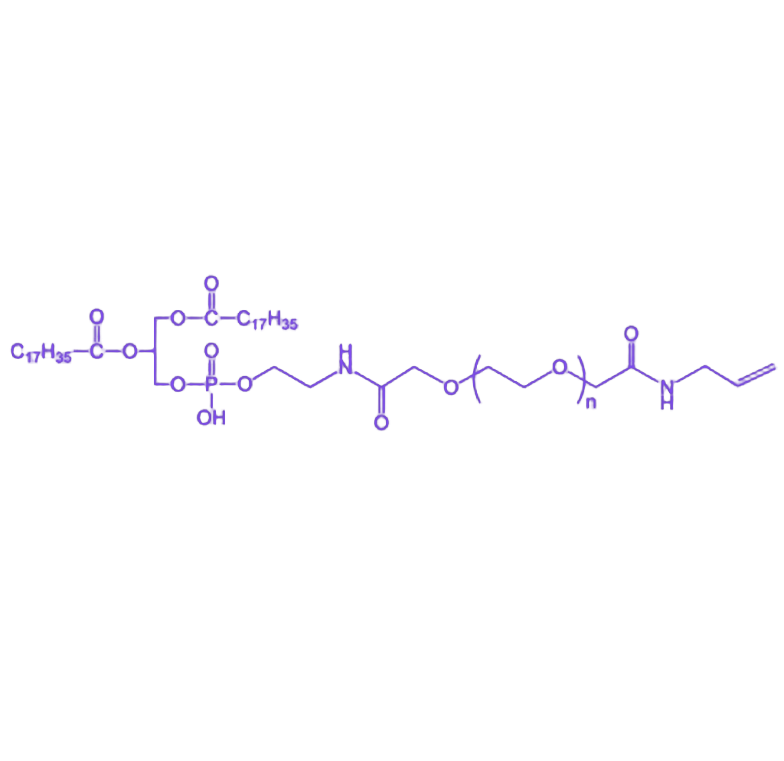 DSPE-PEG-ACA(二硬脂酰磷脂酰乙酰胺-聚乙二醇-丙烯酰胺)是一种具有明确结构的功能性两亲性高分子材料,由磷脂基团、聚乙二醇链段与丙烯酰胺活性基团通过共价键连接而成,在生物医用材料领域展现出独特的应用潜力。 该产品的分子结构以**1,2-二硬脂酰-sn-甘油-3-磷酸乙醇胺(DSPE)** 作为疏水端,通过酰胺键与亲水性**聚乙二醇(PEG)** 链段偶联,末端修饰有**丙烯酰胺(ACA)** 功能性基团。这种双亲分子设计赋予其在水性介质中自组装形成稳定纳米结构的能力,且PEG链段可有效改善材料的生物相容性与血液循环半衰期。丙烯酰胺基团的引入为材料提供了便捷的共价修饰位点,可通过自由基聚合或点击化学反应实现与其他功能分子的偶联,适用于药物递送系统的构建、生物分子固定化及纳米载体表面功能化等应用场景。其理化性质可通过调整PEG分子量与脂质链长度进行精确调控,满足不同应用对粒径分布、表面电荷及稳定性的特定需求。