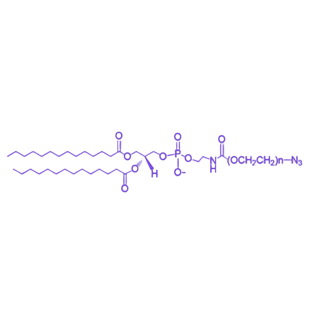 该化合物分子结构由三部分构成:疏水性二肉豆蔻酰磷脂酰胆碱(DMPE)片段、亲水性聚乙二醇(PEG)链段以及末端的叠氮(N3)基团。其中,DMPE作为膜锚定单元可稳定嵌入脂质体或细胞膜结构,PEG链段通过空间位阻效应提升纳米载体的胶体稳定性并减少非特异性蛋白吸附,而末端的叠氮基团则可通过点击化学(如铜催化的Azide-Alkyne环加成反应)实现与含炔基生物分子的高效偶联。其典型物理化学特性包括良好的双亲性、可控的PEG分子量(通常涵盖2000-10000 Da范围)及优异的水相分散性,在中性pH条件下可自组装形成粒径均一的脂质体或纳米胶束。在应用层面,该材料可用于构建主动靶向药物递送系统,通过叠氮-炔基点击反应修饰抗体、适配体等靶向配体;也可作为生物分子固定化支架,在芯片表面构建功能化界面;此外,其在光动力治疗、基因递送等领域的载体功能化修饰中亦展现出独特优势,为精准医学研究提供了灵活的分子工程化平台。