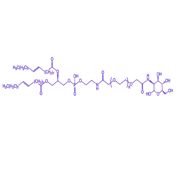 DOPE-PEG-MAN(二油酰磷脂酰乙醇胺-聚乙二醇-甘露糖)是一种兼具脂质双亲性与靶向识别功能的功能性生物材料,通过精确的化学偶联将磷脂分子、聚乙二醇链段与甘露糖基团整合为统一结构。该产品在生物医学领域展现出优异的应用潜力,尤其适用于构建具有主动靶向能力的纳米递送系统。 该化合物的分子结构以二油酰磷脂酰乙醇胺(DOPE)为疏水内核,其两条不饱和脂肪酸链赋予材料良好的膜融合特性,可促进纳米载体与细胞膜的相互作用;亲水性聚乙二醇(PEG)链段通过酰胺键与DOPE共价连接,形成空间位阻屏障以减少网状内皮系统清除,延长体内循环时间;末端修饰的甘露糖基团作为靶向配体,能够特异性识别细胞表面高表达的甘露糖受体,实现药物或活性分子向特定细胞的精准递送。其理化性质表现为在水性介质中可自组装形成稳定的胶束或脂质体结构,临界胶束浓度低且粒径分布均一,动态光散射检测显示平均粒径通常在50-200 nm范围,Zeta电位呈弱负电性。这种结构设计使DOPE-PEG-MAN在肿瘤治疗、疫苗递送及基因转染等领域具备独特优势,既能提升纳米载体的生物相容性与稳定性,又能通过受体介导的内吞作用增强靶细胞摄取效率,为提高治疗效果并降低毒副作用提供了高效解决方案。