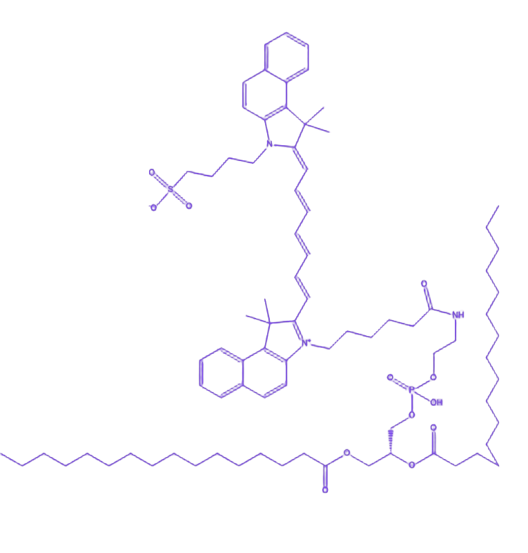 DPPE-ICG是由二棕榈酰磷脂酰乙醇胺(DPPE)与吲哚菁绿(ICG)通过化学连接形成的两亲性复合物,兼具近红外荧光特性与生物成像应用潜力。其分子结构中,DPPE提供两亲性骨架,甘油酯部分通过两个棕榈酰脂肪酸链构成疏水性尾部,另一端通过磷酸基团连接乙醇胺亲水头基;ICG作为三碳花菁染料,赋予复合物近红外荧光性能,其最大发射波长范围为795-845nm。