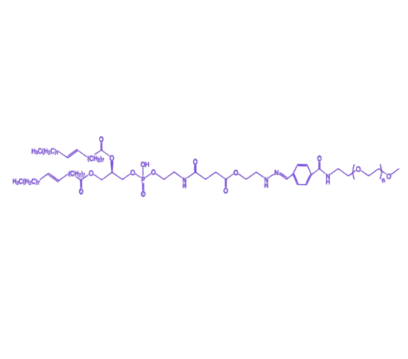DOPE-Hyd-MPEG是一种由二油酰磷脂酰乙醇胺(DOPE)、腙键(Hyd)和甲氧基聚乙二醇(MPEG)构成的磷脂化合物,在药物递送与纳米技术领域具备关键应用价值,其设计整合了各组分的核心特性,可通过形成稳定载体结构、实现靶向释放及优化体内循环等机制提升治疗效果。 < strong > DOPE作为核心脂质组分< /strong >,凭借其天然脂质特性参与构建稳定的脂质体双分子层结构,赋予药物递送系统优异的膜融合能力与生物膜相容性,确保载体能高效穿透细胞膜或靶向组织屏障,为药物分子的细胞内转运提供结构基础。 < strong > 腙键(Hyd)作为pH响应型连接基团< /strong >,在生理环境中维持结构稳定,而在肿瘤微环境或细胞内吞体等酸性条件下发生水解断裂,触发所载药物的定点释放,该特性显著提高了药物在病变部位的局部浓度,同时降低对正常组织的毒副作用。 < strong > MPEG作为亲水性修饰单元< /strong >,通过其高分子链在载体表面形成水化层,有效提升复合物的水溶性与胶体稳定性,同时通过空间位阻效应减少网状内皮系统的识别与清除,延长药物在体内的循环时间,为药物递送系统的体内行为优化提供重要支持。