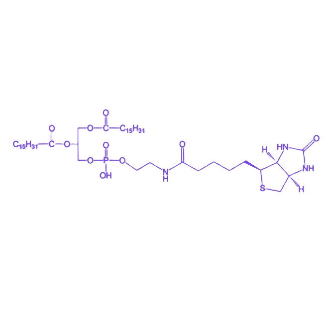 DPPE-Biotin(二棕榈酰基磷脂酰乙醇胺改性生物素)是一类通过DPPE伯氨基直接修饰生物素活性基团的功能性化合物,其分子结构同时整合了磷脂的膜亲和特性与生物素的高特异性结合能力,在生物分子标记、膜生物学研究及药物递送系统构建等领域具有重要应用价值。 该化合物以1,2-二棕榈酰基-sn-甘油-3-磷酰乙醇胺(DPPE)为脂质骨架,通过两个棕榈酰基链提供优异的脂溶性,使其可稳定嵌入细胞膜或脂质体双分子层结构;同时通过共价键连接的生物素(Biotin)基团,能够与链霉亲和素(Streptavidin)形成解离常数极低的特异性复合物,这种双重功能特性使其成为跨学科研究的关键工具分子。 产品外观呈白色粉末状,化学纯度≥95%,可溶于氯仿、甲醇等有机溶剂,其理化性质满足苛刻实验条件下的稳定性要求。在应用场景中,该化合物可通过生物素-链霉亲和素系统实现靶标分子的高效富集与检测,显著提升生物传感器的分析灵敏度;同时在纳米药物递送领域,可借助其膜嵌入能力构建靶向修饰的脂质体载体,实现药物在病灶部位的精准释放。