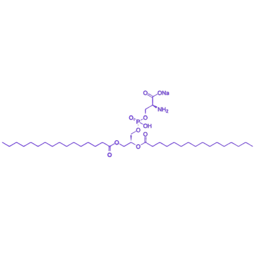 分子的疏水核心由两条通过酯键连接于甘油骨架1、2位的软脂酸链(棕榈酸,C₁₆H₃₂O₂)形成,每条链含16个碳原子的饱和脂肪链,为分子提供膜融合能力与结构稳定性。亲水性头部通过甘油3位羟基与磷酸基团(PO₄²⁻)结合,形成磷酸甘油酯骨架,进一步通过磷酸二酯键连接L-丝氨酸残基,构成磷酸丝氨酸头基;L-丝氨酸的羧基与氨基侧链赋予头基额外电荷与极性,显著增强水溶性及生物活性。为提升水相体系中的溶解性能与稳定性,磷酸基团上的一个氢离子被钠离子(Na⁺)取代,形成磷酸丝氨酸钠盐(PO₃Na⁻),该修饰有效中和磷酸基团负电荷,确保分子在生物实验中的便捷应用。