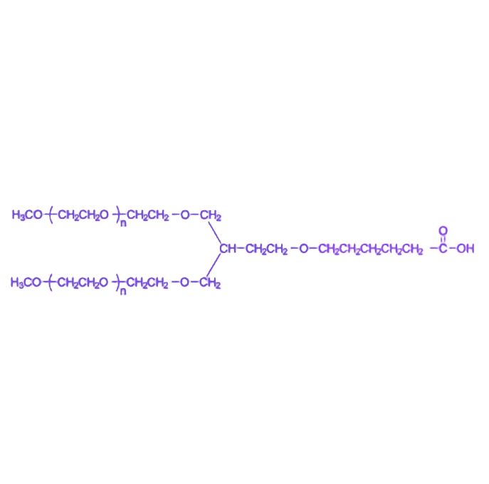 二臂聚乙二醇-己酸(2-Arm PEG-Hexanoic Acid,简称2-Arm PEG-HA)是一种双臂结构的功能化聚乙二醇衍生物,其分子两端修饰有己酸基团(–(CH₂)₅COOH),兼具聚乙二醇(PEG)的高亲水性与己酸端基的反应活性,可作为桥接分子应用于多种化学偶联反应,广泛适用于生物医药材料、药物递送系统及高分子偶联修饰领域。 该分子的核心结构特征为双臂分支型PEG主链,末端通过共价键连接己酸基团,形成对称的双羧基官能化结构。PEG主链赋予分子良好的生物相容性、抗蛋白吸附能力及柔性骨架,而末端的羧基可通过酰胺化或酯化反应与氨基、羟基等官能团高效偶联,双臂设计进一步提升端基密度并支持对称修饰,有利于构建多位点偶联的聚合体系。其己酸链段贡献中等疏水性与分子柔韧性,使材料在水相体系中既能维持分散稳定性,又具备较强的界面适应性,可通过活化羧基(如转化为NHS或SVA酯形式)增强与氨基分子的反应速率。 产品的典型分子量范围为2,000至20,000 Da,且具有良好的分子量分布均一性,这一参数特性确保了在不同应用场景下的性能可控性与批次稳定性。PEG链的“隐形”特性可有效减少免疫识别与血浆蛋白结合,从而延长偶联药物的体内循环时间,这一性能在药物递送系统中具有重要价值。 在具体应用中,该衍生物可用于制备PEG-肽偶联物、PEG-药物前体及多功能纳米颗粒表面包覆材料,也可作为水凝胶交联剂、组织工程支架修饰剂及蛋白质稳定化体系的关键组分。在纳米药物载体的表面修饰中,其双臂结构支持同时偶联两种活性基团,实现载体的双功能化修饰;在生物医学材料领域,可通过表面修饰改善材料的生物相容性与细胞相互作用。此外,该分子在靶向药物载体设计、蛋白质药物长效化及组织工程支架功能化等前沿领域展现出潜在应用前景。
