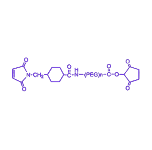 PEG45 长链(约 45 个乙二醇单元)赋予产品显著优势:一是明显提升水溶性,减少交联后生物分子的聚集风险;二是提供充足空间柔韧性,降低反应空间位阻,提高偶联效率;三是降低免疫原性和毒性,满足生物医学应用要求。相较于短链 SMCC 交联剂,本品更适合复杂生物分子(如抗体、大分子酶)的修饰,且环己烷桥结构增强了马来酰亚胺基团的水溶液稳定性,延长反应窗口期。