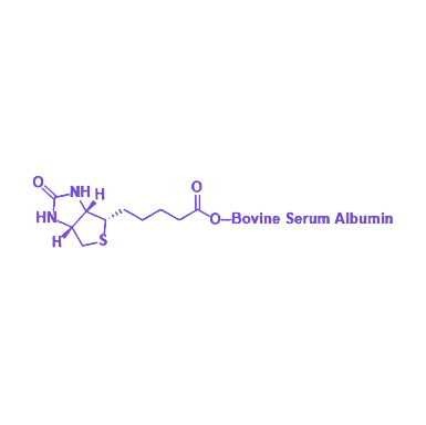 牛血清白蛋白作为载体骨架,凭借优异的 水溶性结构稳定性,为生物素提供了良好的分子支撑与分散媒介,确保复合物在实验体系中保持活性状态。生物素则通过其与 亲和素(avidin)链霉亲和素(streptavidin) 之间的高亲和力(解离常数可达 10⁻¹⁵ M 级别)形成不可逆结合,这一特性赋予复合物在免疫检测、蛋白分离、细胞成像等场景中的精准靶向能力。