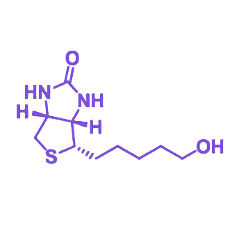D-Biotinol(D-生物素醇)是 D-生物素 的衍生物,通过将末端羧酸基团(–COOH)还原为羟甲基(–CH₂OH)形成,保留生物素核心识别结构的同时改变了化学反应活性。 其结构修饰主要体现在生物素咪唑环的5位引入羟基(-OH),并将羧基转化为羟甲基,形成醇类分子结构。官能团的变化使其失去与链霉亲和素结合的能力,但保留了核心骨架的代谢活性;新增的羟基则提供了与醛基、金属离子等发生缩合或配位反应的位点,显著扩展了化学修饰潜力。立体构型上仍保持 D-构型,确保其与生物素代谢途径的兼容性。