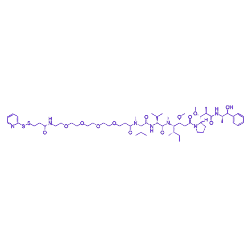 SPDP-PEG4-MMAE是一种用于抗体偶联药物(ADC)研发的功能性复合分子,由SPDP(琥珀酰亚胺-3-(2-吡啶基二硫代)丙酸酯)、PEG4(四聚乙二醇)和MMAE(单甲基澳瑞他汀E)三部分构成,通过两步定向偶联策略实现抗体与药物分子的高效连接,可显著提升ADC药物的靶向性和治疗效果。