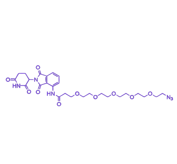 Pomalidomide-PEG5-Azide 是一种基于 泊马度胺(Pomalidomide) 母核结构设计的小分子功能衍生物,通过在母核或特定活性位点引入五单元聚乙二醇(PEG5)链段及末端修饰 叠氮基(-N₃),实现了小分子药物核心、亲水柔性链与高活性点击化学官能团的一体化整合。该分子凭借模块化设计、高反应特异性及良好生物相容性,为化学生物学研究、分子成像、纳米材料功能化及药物递送系统构建提供了可靠工具。 其分子结构中,PEG5 链段的引入显著提升了分子水溶性与柔性,有效减少分子间疏水聚集及非特异性吸附。同时,该链段在偶联过程中提供充足空间距离,避免连接位点与母核结构的直接干扰,确保偶联产物的结构稳定性和功能完整性。PEG5 链段的延展性赋予分子更高的空间自由度,在与蛋白质、多肽或纳米材料结合时可显著降低空间位阻,保障偶联反应高效完成并生成稳定产物。 末端 叠氮基(-N₃)作为典型点击化学官能团,可通过 铜催化叠氮-炔烃环加成(CuAAC)或 无铜应力促进环加成(SPAAC)反应与炔基分子高效偶联,形成稳定的三唑键连接。这一特性使其在生物正交化学、功能化材料构建及靶向分子偶联等领域具备突出应用价值,为复杂生物体系中精准分子修饰与功能探针开发提供了灵活解决方案。