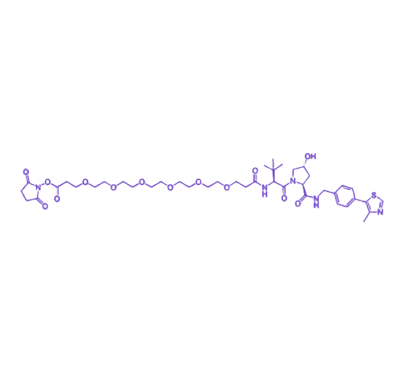 (S,R,S)-AHPC-PEG6-NHS 是一款基于 VHL E3 泛素连接酶配体的 PROTAC 连接子,由(S,R,S)-AHPC 特异性配体、六聚乙二醇(PEG6)间隔臂与 NHS 活性酯基团共价连接而成,可作为蛋白降解技术研究的关键工具分子。其核心配体(S,R,S)-AHPC 能高亲和力招募 VHL 泛素连接酶复合体,PEG6 间隔臂通过增强分子水溶性和优化三元复合物空间构象提升降解效率,末端 NHS 酯基团可与含伯胺基的靶蛋白配体(如小分子抑制剂、抗体片段)高效偶联,形成稳定的酰胺键连接产物。 该产品化学纯度≥95%,理论分子量约 892 Da,采用常温运输模式,需-20℃密封避光保存以防止 NHS 酯基团水解失活。已成功应用于 BRD4、BTK 等癌症相关靶蛋白的降解研究,并支持光控激活型 PROTAC 构建、点击化学修饰等前沿应用场景。通过模块化设计与不同靶蛋白配体偶联,可实现疾病相关蛋白的特异性降解,为肿瘤治疗药物研发及细胞信号通路研究提供新型化学工具。