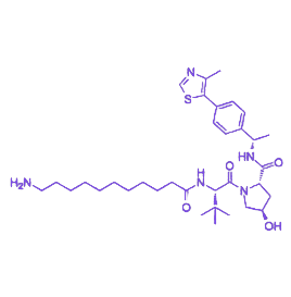 其核心单元AHPC作为VHL E3泛素连接酶的特异性配体,通过准确分子相互作用与VHL蛋白稳定结合,为靶蛋白泛素化提供酶学基础。甲基取代的C10烷基链(含10个碳的直链烷基,近末端含甲基分支)作为连接臂,兼具超长链的空间跨度(约15Å)与甲基引入的适度刚性,可适配靶蛋白与VHL结合位点间距12-18Å的场景,同时减少长链的无序折叠。末端伯氨基作为反应位点,可与含活性酯或羧酸(经活化)的靶蛋白配体发生酰胺化反应,实现功能模块的共价组装。