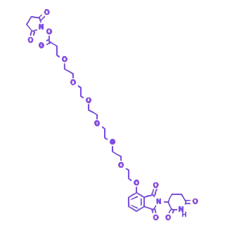 其分子结构包含三个关键功能单元:沙利度胺衍生的 cereblon(CRBN)配体,提供PROTAC分子的E3泛素连接酶结合能力;六聚乙二醇(PEG6)连接子,赋予化合物良好的水溶性及柔性链特性;N-羟基琥珀酰亚胺酯(NHS ester),作为活性反应基团,可与含伯胺的分子(如蛋白质、肽类或小分子配体)发生酰胺键形成反应,实现高效生物偶联。