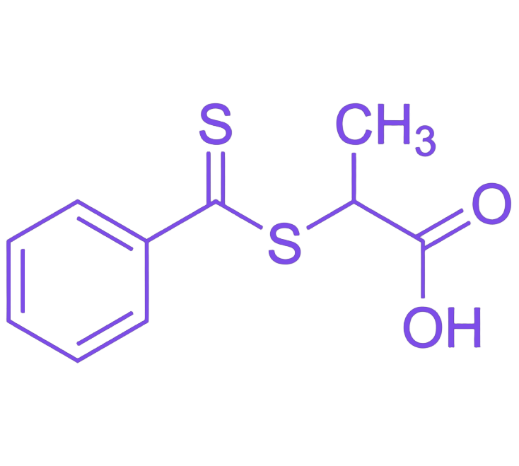 2-(苯基硫代羰基硫代)丙酸是一种结构针对性的二硫代氨基甲酸酯类RAFT链转移剂,其分子设计平衡了单体适用性与功能化潜力,通过丙酸单元(R基团)、二硫代氨基甲酸酯键(活性中心)、苯基(Z基团)及末端羧酸基团的协同作用,实现对丙烯酸酯类单体的高效可控聚合,并保留便捷的后修饰能力,是高性能聚合物及功能材料合成的可靠分子工具。