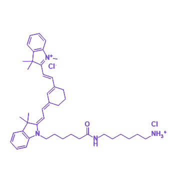 Cy7-NH₂是一种通过化学合成将氨基(-NH₂)官能团引入花菁染料Cy7结构的近红外荧光染料,兼具Cy7的光学特性与氨基的化学反应活性,可作为生物分子标记及检测的关键工具。 该化合物以Cy7染料为母体结构,通过特定化学合成方法实现氨基的共价连接,其核心特性体现在两个方面:一方面保留Cy7染料在近红外波段的强烈吸收与发射能力,确保荧光信号的高效检测;另一方面引入的氨基活性基团赋予其与含互补活性基团(如羧基、醛基等)分子的偶联反应能力,可实现对蛋白质、核酸等生物分子的精准标记。 基于上述特性,Cy7-NH₂广泛应用于生物医学研究及化学分析领域,例如通过与靶向分子偶联构建荧光探针,用于活体细胞成像、疾病标志物检测及药物递送追踪等场景,为生命科学研究提供高灵敏度、高特异性的技术支持。