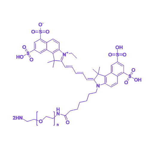 Cy5.5-PEG-NH₂是一种由Cy5.5近红外荧光染料、聚乙二醇(PEG)链与氨基(-NH₂)共价连接形成的功能性化合物,兼具荧光成像性能、生物相容性及化学修饰活性,在生物医学研究及生物成像领域具有重要应用价值。