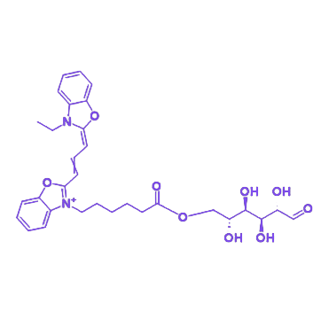 CY2-D-甘露糖是通过将CY2荧光染料与D-甘露糖分子共价连接形成的功能性荧光探针,兼具荧光示踪能力与生物学靶向特性,在生命科学研究中可用作高特异性的生物标记工具。 CY2荧光染料作为分子结构中的荧光报告基团,其核心为具有共轭体系的菁类化合物,两端杂环取代基通过π电子离域作用赋予分子在特定激发波长下的荧光发射特性,为生物样本的荧光成像提供光学信号基础。 D-甘露糖作为生物活性配体,属于单糖家族成员,其化学结构与葡萄糖相比仅存在一个手性碳原子的构型差异,这种结构特性使其能够保留与生物体内天然糖基识别系统的相互作用能力,为探针分子提供生物学靶向功能。 该探针通过荧光基团与生物活性分子的协同作用,可广泛应用于细胞内糖代谢路径示踪、糖蛋白定位分析及细胞表面受体动态观察等研究场景,为细胞生物学及生物化学领域的微观机制研究提供可视化技术支持。