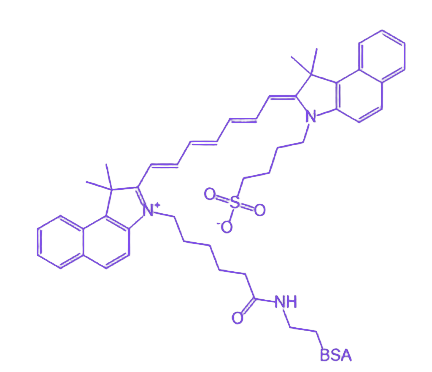 ICG作为近红外荧光染料,具有良好的光学稳定性和生物相容性,其最大吸收波长约为800-810nm,发射波长在820-840nm范围,可在近红外光区域产生强烈荧光信号,该波段光因在生物组织中穿透性强、背景干扰低而适用于生物成像。BSA作为常用载体蛋白,具备良好的水溶性、生物相容性和低免疫原性,能有效改善ICG在体内的稳定性、溶解性及药代动力学性质。两者通过共价键结合形成的ICG-BSA共轭分子,协同发挥荧光示踪与载体运输功能,增强了在生物体内的靶向性及作用效果,为生物医学研究中的成像分析提供了可靠工具。