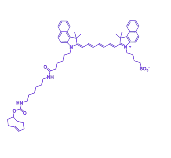 ICG-TCO(吲哚菁绿-反式环辛烯)是通过共价连接近红外荧光染料吲哚菁绿(ICG)与反式环辛烯(TCO)官能团形成的化合物,兼具ICG的光学成像能力与TCO的生物正交反应活性,主要应用于生物正交化学领域。其核心机制是TCO基团与四嗪(Tetrazine)发生快速、特异的逆电子需求狄尔斯-阿尔德反应(IEDDA Reaction),实现生物分子的荧光标记与追踪。 近红外发光特性与高光稳定性确保该化合物可满足深层组织成像及长时间动态追踪需求,避免生物样本自发荧光干扰。TCO与四嗪的点击反应速率极快,能实时捕获动态生物过程,且反应特异性高,有效降低非靶向标记干扰。 化合物具备良好生物相容性,ICG的水溶性与TCO的生物正交性共同保障其对细胞活性影响较小,适用于活体成像及体内实验。在应用场景中,可支持生物成像、药物递送、蛋白质标记及生物正交化学标记等多维度研究需求,为复杂生物体系的精准分析提供工具支持。