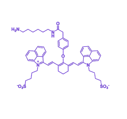 氨基修饰为FD-1080-NH₂带来多重核心优势。首先,氨基作为活性反应位点,可与蛋白质、抗体、核酸等生物分子共价连接,显著增强靶向性,实现对特定细胞或组织的精准标记与成像。其次,氨基的引入可能在一定程度上改善染料的溶解性和稳定性,使其更适应复杂的生物环境。此外,氨基为后续化学修饰提供了灵活性,例如可与羧基(-COOH)发生酰胺化反应,或与活性酯(如NHS酯)反应,便于构建更复杂的探针系统。