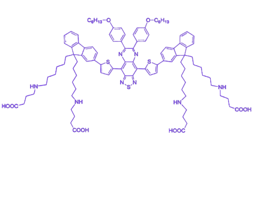 TTQ-COOH是一款基于近红外二区(NIR-II,1000-1700 nm)波段的荧光染料,以4,9-双(5-溴噻吩-2-基)-6,7-双(4-(己氧基)苯基)-(1,2,5)噻二唑并(3,4-G)喹喔啉(TTQ)为强电子受体核心,末端修饰羧基(-COOH)功能基团,通过精准的“D-A”电子结构设计与功能化修饰,实现高效光学性能与灵活修饰活性的协同,成为生物医学准确成像领域的重要工具分子。