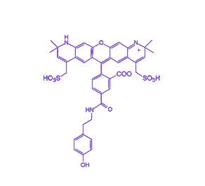 APDye568-Tyramide 是一款专为 酪胺信号放大(TSA)技术 设计的红光荧光探针,通过整合酪胺基团的酶促放大特性与 APDye568 红光波段的高穿透性,有效解决低丰度靶标检测中的灵敏度瓶颈问题。其核心机制依托 辣根过氧化物酶(HRP) 催化反应,在 H₂O₂ 存在时,酪胺基团被氧化为活性中间体,快速与靶标周围富电子基团(如酪氨酸残基)共价结合,形成局部荧光信号簇,实现信号级联放大,经 TSA 放大后信号强度显著提升,远超传统无放大标记探针。 该探针的光学性能表现优异,吸收/发射波长分别为 578/605nm,消光系数达 135,000 cm⁻¹M⁻¹,荧光量子产率 0.68,确保高亮度荧光输出。反应特异性高,仅在 HRP 标记抗体结合区域发生,非特异性背景低,且不影响靶标空间定位,适配高分辨率成像需求。经分子修饰优化后,探针水溶性与稳定性显著提升,可在 30% 水含量的体系中稳定反应,pH 适用范围 7.0-8.5,抗光漂白性良好,保障实验结果的可靠性与重复性。 实验兼容性方面,该探针可与 FITC(绿色)、Cy5.5(近红外)等探针实现多色联用,满足复杂生物体系多靶标同步放大检测需求。储存需避光-20℃密封干燥保存,建议分装为 50μg/管以避免反复冻融,常规提供 100μg、500μg 规格,广泛适用于科研领域中低丰度靶标的高灵敏度检测场景。