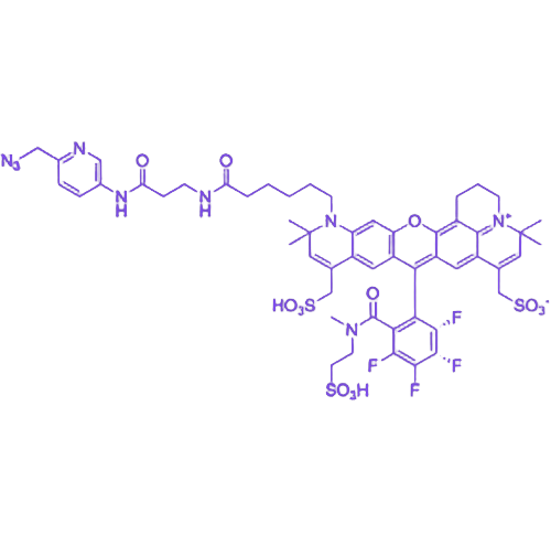 分子结构中引入吡啶甲基(Picolyl)和叠氮(–N₃)功能团,叠氮基团作为关键反应位点,为生物分子标记提供高选择性和高产率连接方式;吡啶甲基修饰可提升铜(I)催化“点击化学”反应效率,通过加快反应动力学和降低铜离子使用浓度,减少对生物体系的潜在毒性。产品兼具高亮度、良好水溶性和低背景特性,在保持高光稳定性的同时提升偶联效率,使标记反应在温和条件下进行,较大程度保留蛋白质、核酸或多肽等生物分子的结构与功能活性。