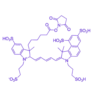 APDye660-NHS是基于近红外荧光染料APDye660的N-羟基琥珀酰亚胺(NHS)活化衍生物,整合了近红外荧光染料的高亮度与光稳定性,以及NHS的高效化学偶联能力,为蛋白质标记、抗体偶联及分子探针构建提供理想工具。其核心特性在于NHS酯基团能特异性与含氨基生物分子反应形成稳定酰胺键,且反应条件温和,可在不破坏目标分子活性与结构完整性的前提下实现快速偶联。