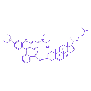 RB-Cholesterol 是一种通过化学修饰将天然胆固醇分子与罗丹明B(Rhodamine B, RB)荧光染料共价连接形成的荧光标记胆固醇衍生物,兼具胆固醇的生物学功能与罗丹明B的强荧光特性,为脂质相关研究提供可视化追踪工具。 胆固醇作为细胞膜的关键成分,参与调控膜流动性、脂筏形成及细胞信号转导等重要生理过程;罗丹明B的引入使该衍生物具备显著荧光信号,其激发波长为550 nm,发射波长为580 nm,可通过荧光显微镜或流式细胞术等技术实现对胆固醇在细胞膜、脂蛋白及人工膜模型中分布与动态行为的实时监测。 该分子广泛应用于膜生物学机制研究、脂质代谢路径示踪及药物递送系统开发等领域,为解析胆固醇的生理功能、揭示脂质相关疾病的分子机制提供了重要实验手段。
