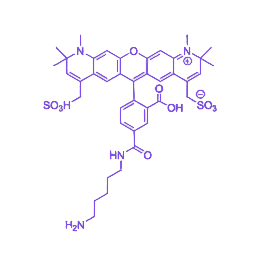 经分子修饰优化,探针水溶性佳,可直接溶于纯水或生理缓冲液(无需有机助溶剂),避免 DMSO 对敏感生物分子(如酶、活细胞)的毒性影响,适配完全水相的羧基标记场景。稳定性方面,探针在 pH 5.0-9.0 范围内荧光强度波动≤7%,室温下水溶液可稳定保存 24 小时,-20℃ 冷冻保存 6 个月活性保留率~90%;抗光漂白性突出,连续激发 2.5 小时荧光残留率~68%,适配长时间动态成像。实验兼容性上,可与 FITC(绿色)、Cy5.5(近红外)实现多色联用,常规提供 1mg、5mg、10mg 规格,储存需避光-20℃密封干燥保存,分装为小剂量避免反复冻融,适配科研中羧基靶向标记与高信噪比成像需求。