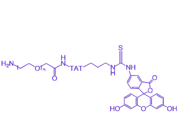 聚乙二醇链段作为柔性连接单元,凭借优异的亲水性和生物相容性,可显著改善化合物的水溶解性能,同时降低其在生物体内的免疫原性,为不同功能基团的协同作用提供结构支持。来源于HIV-1 Tat蛋白的穿膜肽(TAT)具有强效细胞膜穿透能力,能够介导与之偶联的生物分子或材料跨越细胞膜屏障进入细胞内部,有效拓展了该化合物在细胞内递送及相关研究中的应用潜力。异硫氰酸荧光素(FITC)作为荧光标记基团,在495nm左右具有最大吸收峰,发射波长约为515-520nm,可稳定发出绿色荧光,适用于荧光显微镜、流式细胞术等多种实验技术,便于对目标分子的定位、动态追踪及生物过程的可视化监测。化合物末端的氨基(-NH2)作为关键活性反应位点,可与含羧基、醛基等活性基团的分子发生共价反应,实现对药物分子、生物探针或纳米载体等材料的高效偶联,进一步扩展其在靶向递送、生物成像及疾病治疗等领域的应用范围。